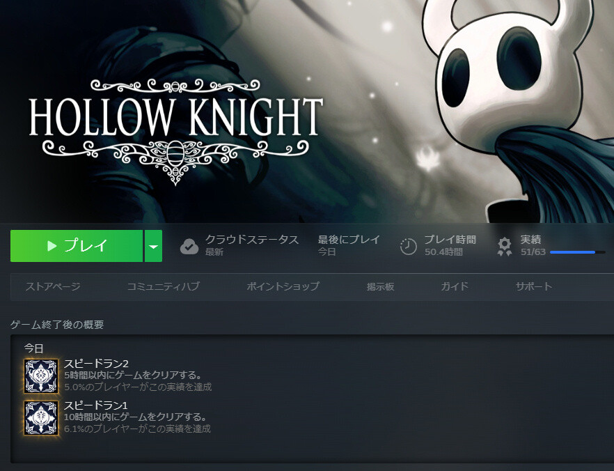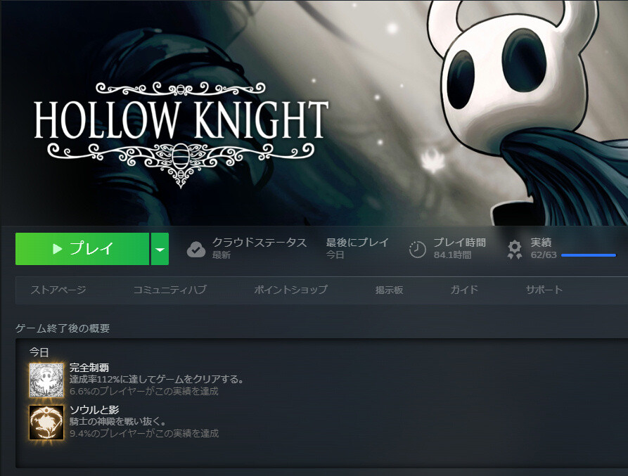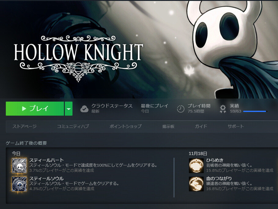 んで、先日 Hollow Knight の実績を一つ残してあらかたゲットしたので、本腰入れて遊び始めた。